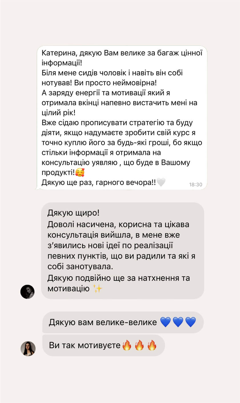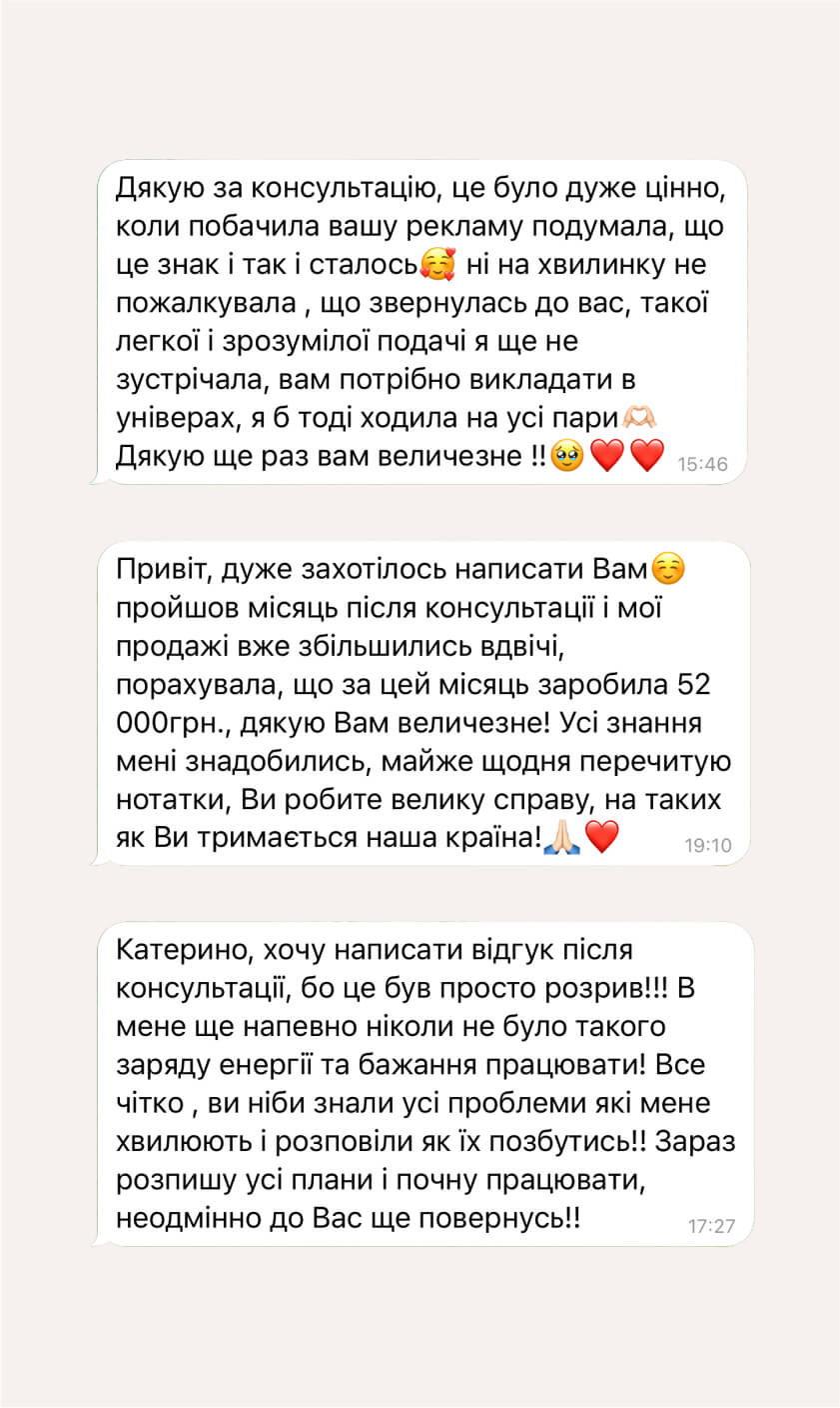 Ми періодично проводимо вебінари та прямі ефіри для наших учасників, де кожен має змогу задати своє запитання та отримати відповідь. Тому слідкуйте за Катериною в соціальних мережах♥️